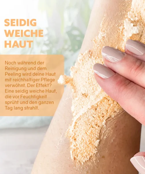 Dette unike pleieproduktet ble laget for å tilby huden din et omfattende velværeprogram, som kombinerer de beste egenskapene til dusjsåpe, skrubb og lotion i ett produkt. Den silkemyke teksturen smelter og skummer på huden, og etterlater en ren, forfriskende følelse. Smuss og urenheter fjernes uanstrengt mens du nyter fordelene med en skånsom, naturlig skrubb som glatter ut huden din uten å irritere den. Selv under rensing og peeling blir huden din bortskjemt med rik pleie. Effekten? Silkemyk hud som sprudler av fuktighet og stråler hele dagen lang.